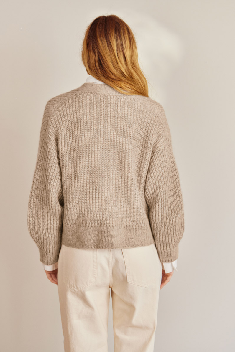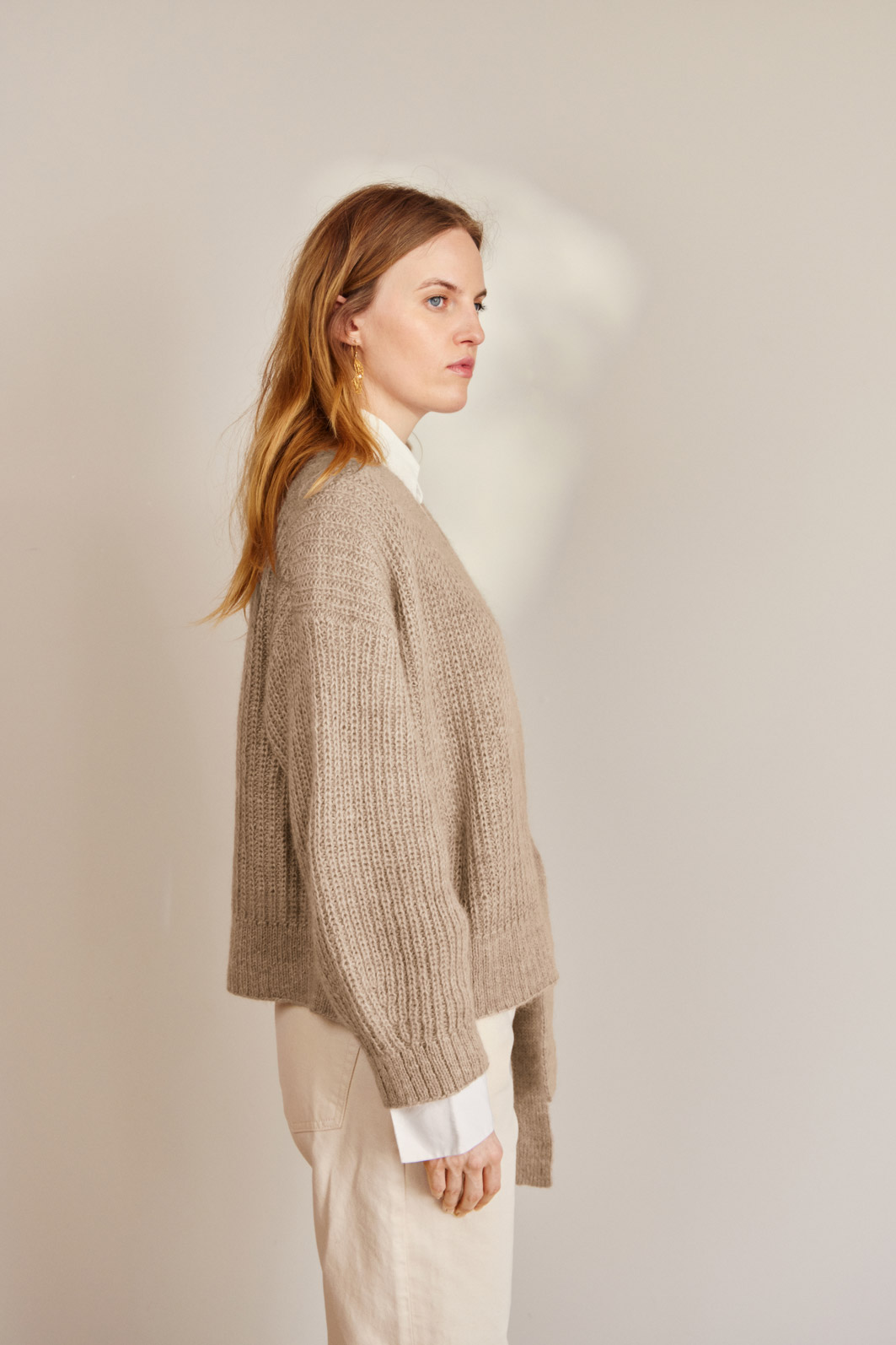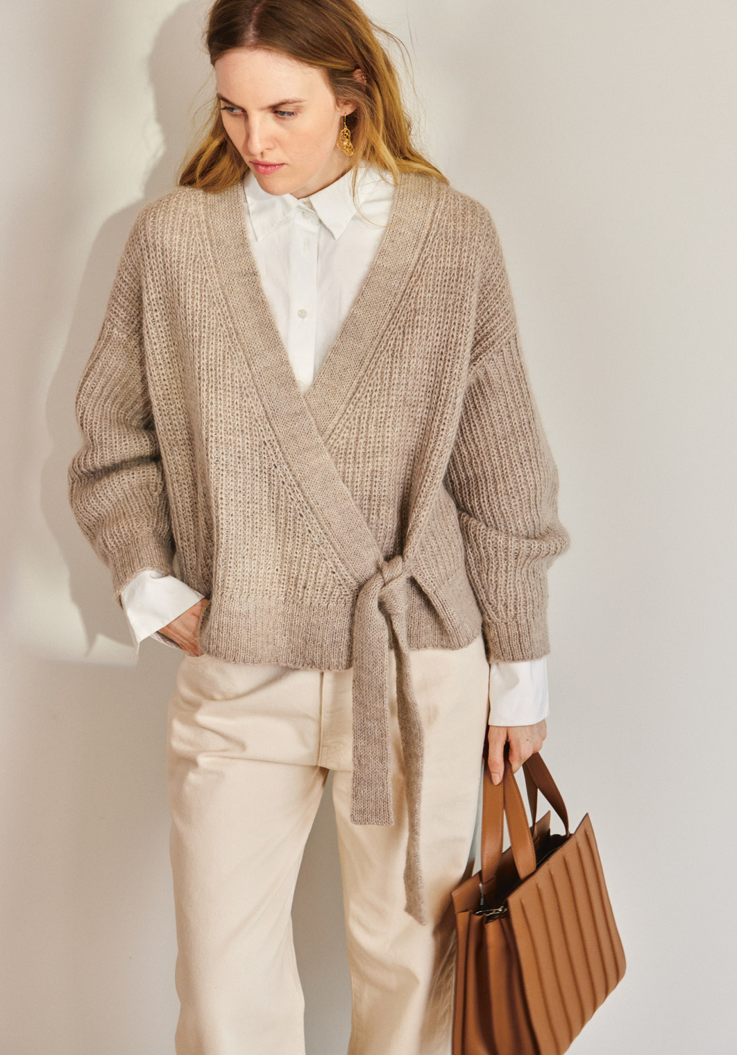Ülevalt alla kootud hõlmikkardigan on kootud soonikmustriga Tynn Peer Gynt ja Tynn Silk Mohair lõngast. Kudumise juhend on inglise keeles.